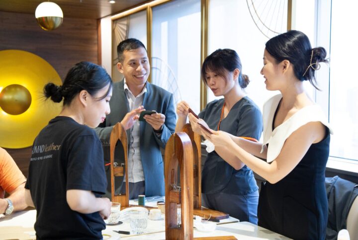 დ Trải nghiệm chế tác thủ công – từ cắt, khâu đến hoàn thiện sản phẩm như ví mini, ly bọc da, tag hành lý, vòng tay da, …
